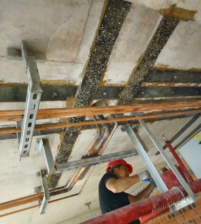 粘鋼加固是通過結構膠將鋼板與樓板混凝土表面粘結,使鋼板與原結構共同受力,從而補充樓板開洞后損失的抗彎、抗剪承載力,恢復結構的安全性和穩(wěn)定性。結構膠的粘結強度是關鍵,需能有效傳遞應力,讓鋼板和混凝土協(xié)同工作。